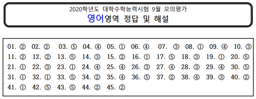| [2020년 고3 9월] 영어 모의고사 문제지, 문제정답, 오답률, 영어듣기파일, 대본 (0) | 2024.07.24 |