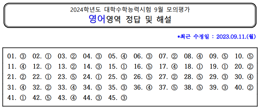 | [2024년 고3 9월] 영어 모의고사 문제지, 문제정답, 오답률, 영어듣기파일, 대본 (1) | 2025.08.09 |