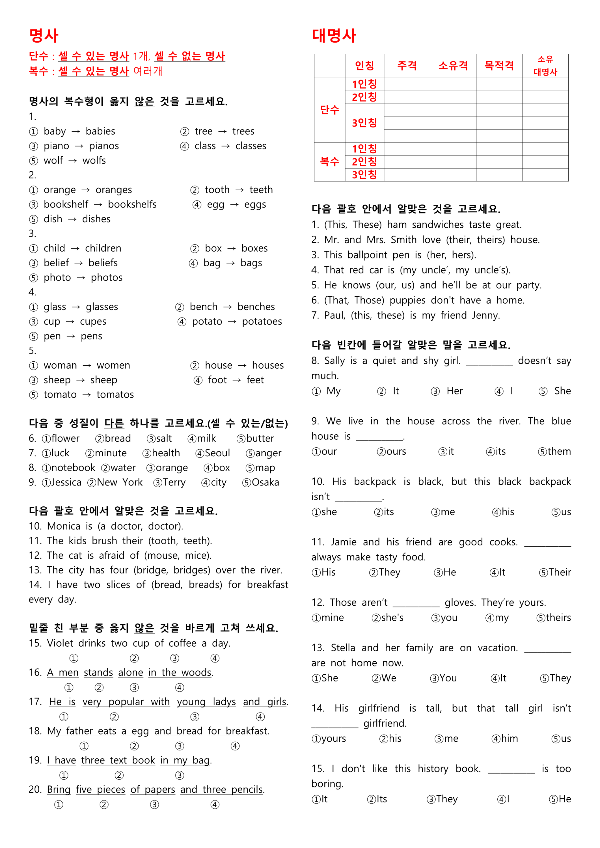 명사 · 대명사 한 장 복습 테스트지
