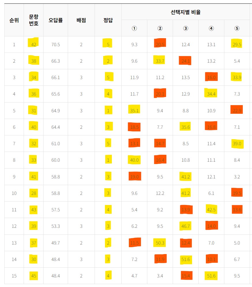 1위 42번 답 ⑤ / 많이 고른 오답 ②