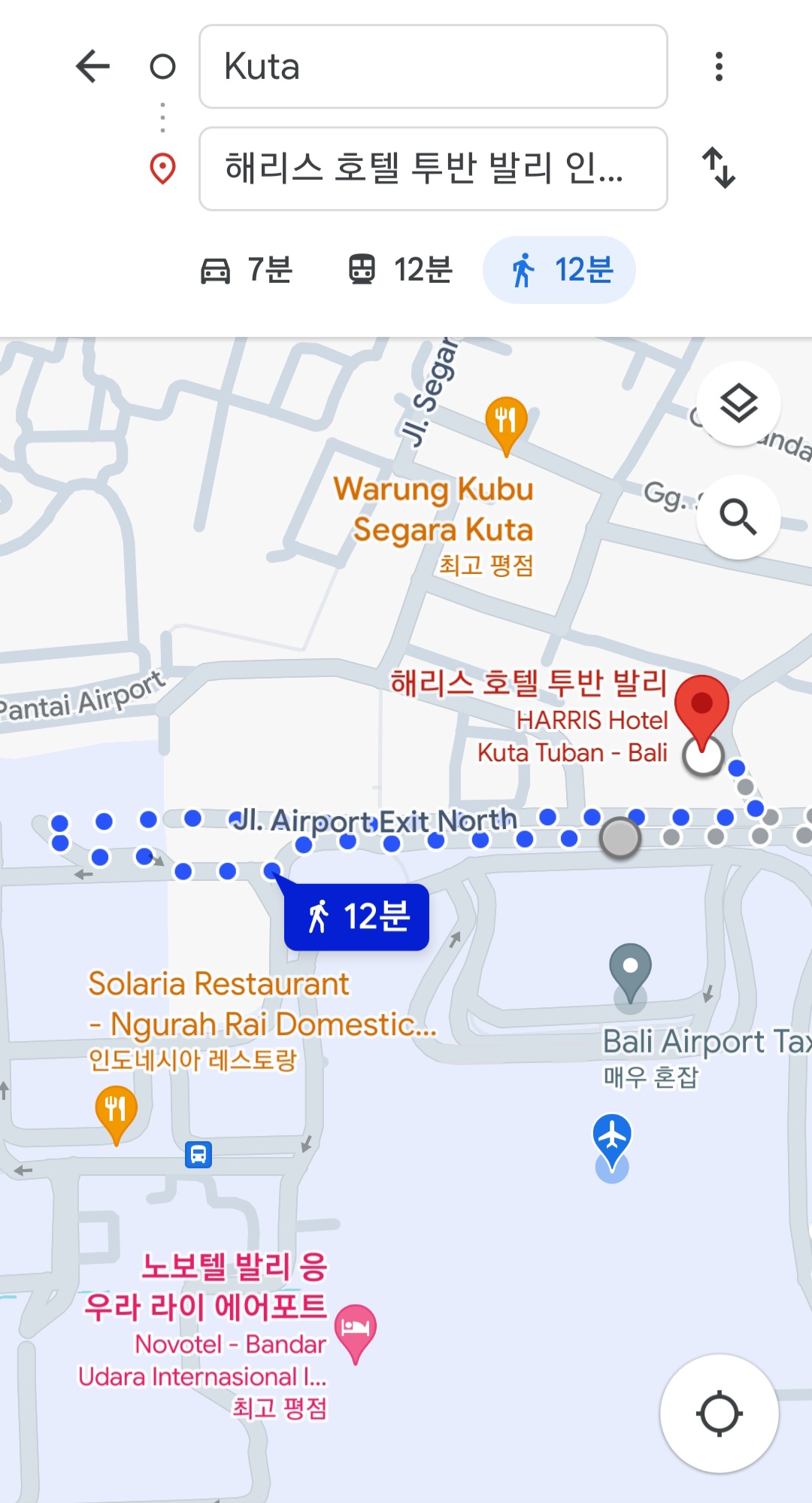 공항 바로 앞이어서 선택했지만 조금 돌아가야 한다😢 공항에서 나오면 택시 아저씨들한테 호텔을 말하면 삥~ 돌아가야 한다면서 택시를 타라 고한다. 근데 걸어서 10분 정도 걸리기에 택시를 굳이(?) 안타도 되는 거리이긴 하다. 아래 파란색 점선이 나타낸 대로 왼쪽으로 갔다가 오른쪽으로 약간 돌아가야 한다.