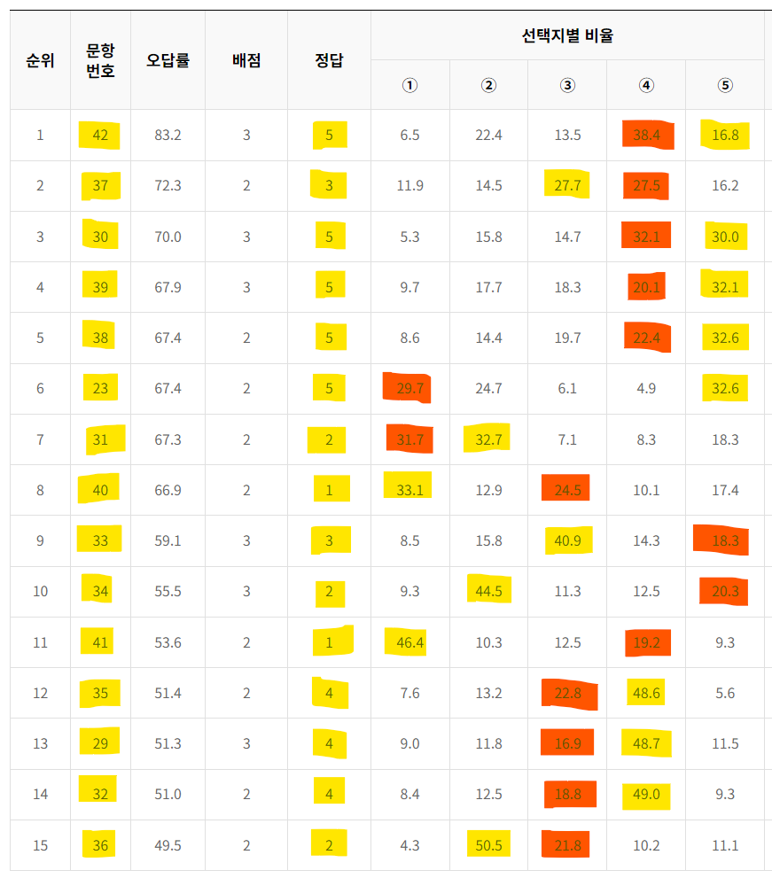 문항별 오답률 TOP 15