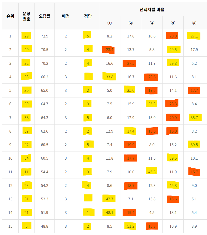 문항별 오답률 TOP 15